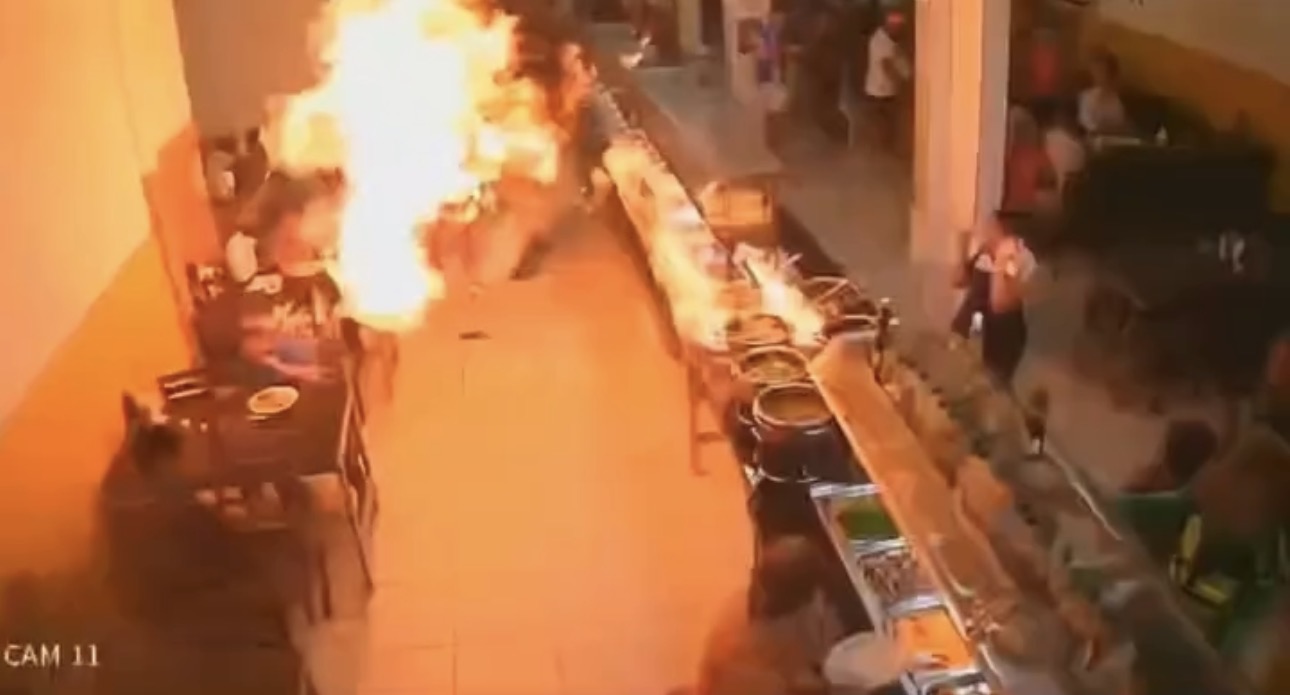 No vídeo, é possível ver uma funcionária na área do buffet no instante em que ela acende uma panela com álcool. Segundos depois, ocorre a explosão, provocando pânico entre clientes e funcionários que estavam no local.