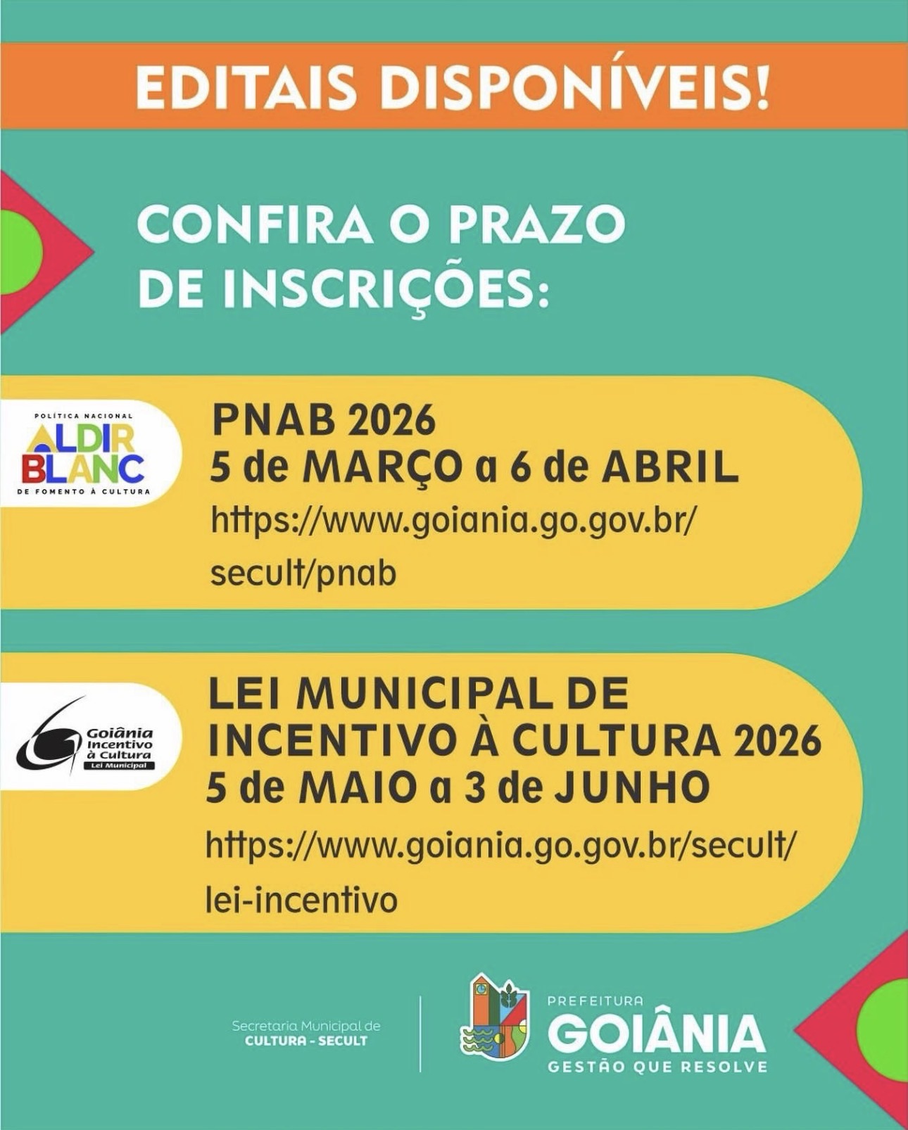 Informações detalhadas sobre os editais, critérios de participação, prazos e formas de inscrição estão disponíveis na página oficial da Secretaria Municipal de Cultura, no site da Prefeitura de Goiânia: www.goiania.go.gov.br/secult