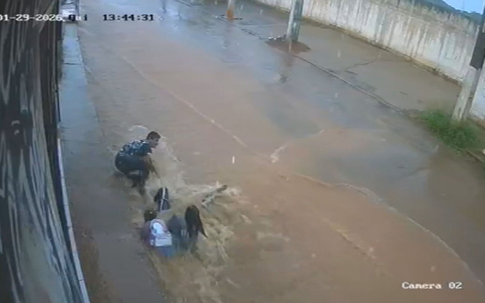 Uma mulher e a sobrinha dela foram arrastadas pela água de uma forte chuva que caiu em Valparaíso de Goiás, no Entorno do Distrito Federal. Câmeras de segurança registraram o momento em que elas descem a rua, levadas pela força da correnteza que se formou. Um comerciante tenta ajudá-las, mas também cai e é arrastado.
